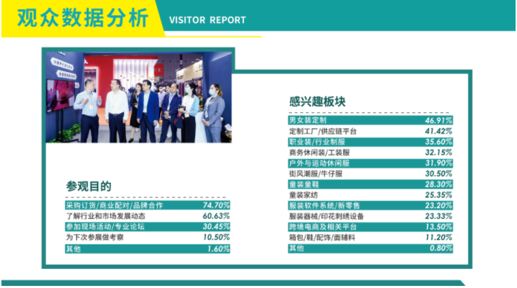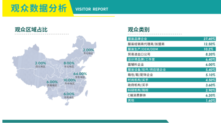 本屆展會展示面積達120000㎡,吸引了來自全國各地118603位專業觀眾人次到場,以及100+商貿配對會,60+現場會議、活動、走秀等。為期三日的展會,為廣大服裝行業同仁提供了集中、高效的商貿平臺。
